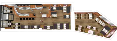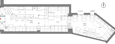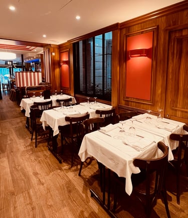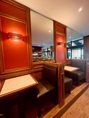 Ce restaurant parisien de type brasserie souffrait d’un manque de cohérence : espaces encombrés, lumière peu flatteuse, acoustique agressive. L’enjeu était de remettre de l’ordre, du confort et du sens, tout en affirmant une identité forte.