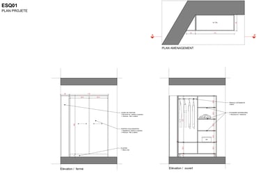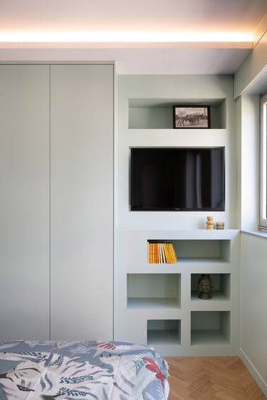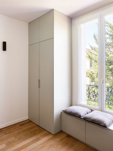 De nombreuses menuiseries sur mesure ont été créées afin de structurer les volumes sans les alourdir. Rangements intégrés, niches, séparations discrètes : chaque élément a été pensé pour organiser l’espace, créer des zones distinctes et faciliter le quotidien. Les coins nuit, travail et détente cohabitent naturellement, dans une lecture fluide et lisible des pièces.