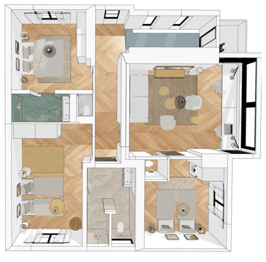 Le projet s’est construit comme un dialogue entre les envies des parents et celles des adolescents. Tous partagent une même passion pour le voyage, fil conducteur de la rénovation. Matières chaleureuses, touches graphiques, références subtiles à l’ailleurs : chaque chambre raconte une histoire, sans jamais tomber dans le décoratif excessif. Les volumes ont été optimisés, les circulations fluidifiées, et les usages repensés pour offrir confort, intimité et fonctionnalité au quotidien.