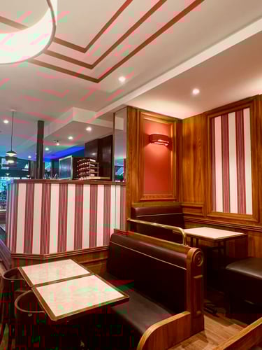 Un lien stylistique devait également être créé avec le restaurant italien attenant, appartenant au même propriétaire. Le fil rouge s’est imposé naturellement : le liseré rouge des banquettes en cuir existantes, devenu point d’ancrage du projet. Autour de cet élément, les codes des grandes brasseries parisiennes ont été revisités dans un esprit rétro assumé, élégant mais vivant.