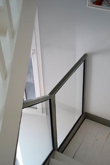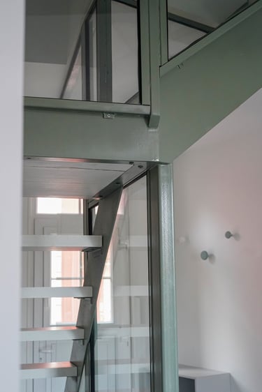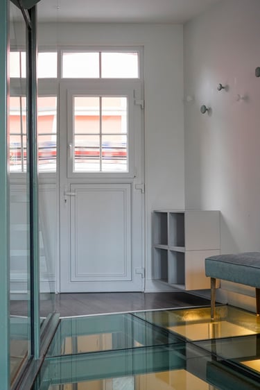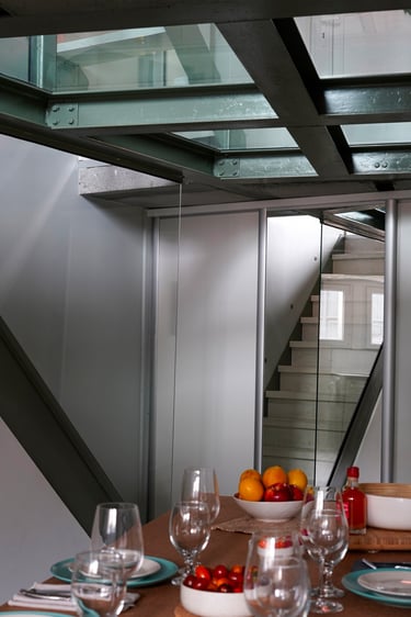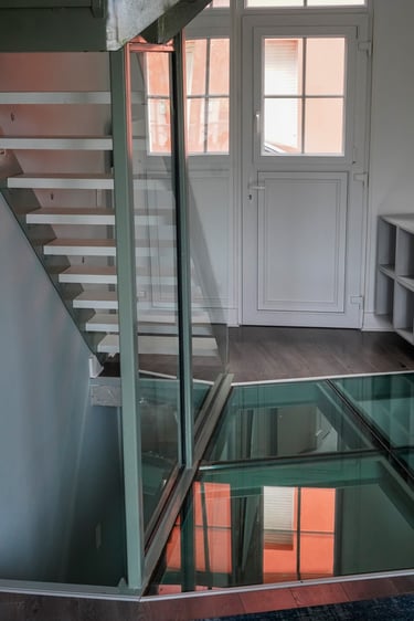 Le sol a été partiellement décaissé afin d’intégrer une structure en verre, véritable puits de lumière au cœur de la maison. Ce geste architectural fort a permis de faire circuler la lumière naturelle à travers les différents niveaux et de redonner une lecture claire des espaces. L’escalier a été entièrement redessiné, devenu un élément central du projet, à la fois fonctionnel et structurant.