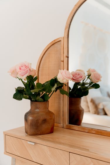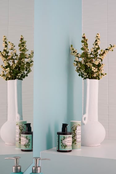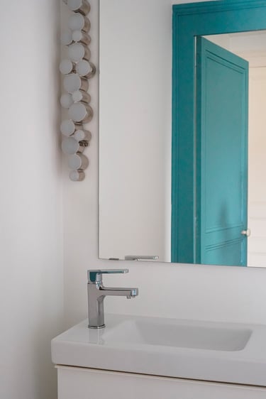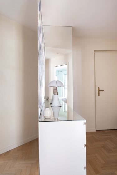 Les clients ont fait le choix fort de reprendre exactement les mêmes teintes de peinture que dans leur appartement cannois. Ce parti pris crée un lien immédiat entre les deux lieux et installe une continuité rassurante, presque instinctive. Dès l’entrée, un couloir distribue l’ensemble des pièces. Un jeu de miroirs a été travaillé avec précision afin d’apporter de la lumière, d’ouvrir les perspectives et de transformer un espace initialement sombre en un passage lumineux et élégant.