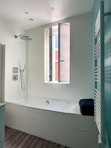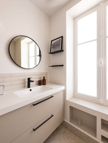 Une véritable entrée a été créée grâce à une claustra, afin de structurer l’arrivée dans l’appartement, jusque-là ouverte directement sur la pièce à vivre. Ce simple geste a permis de redéfinir les circulations et d’installer une transition claire entre l’extérieur et l’intimité du logement. La cuisine, les pièces d’eau et les WC, devenus obsolètes, ont été entièrement repensés dans un esprit fonctionnel et intemporel.
