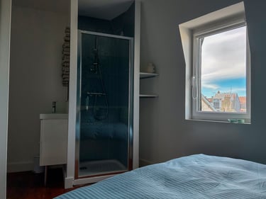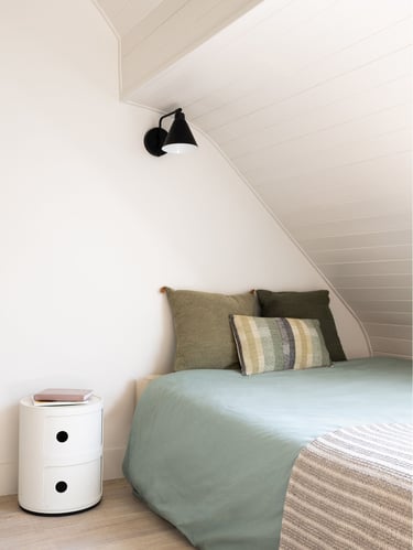 L’enjeu était de travailler les volumes avec précision afin d’intégrer une chambre, une salle de douche, des WC et un dressing, sans jamais contraindre la lecture de l’espace. Les lignes courbes du toit ont guidé les choix d’aménagement, avec des solutions sur mesure pensées pour s’adapter à la géométrie du lieu et optimiser chaque zone.