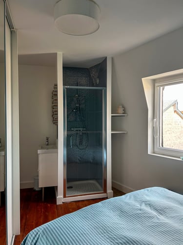 L’escalier, initialement ouvert, a été fermé afin de préserver l’intimité des parents et de créer une vraie séparation avec le reste de la maison. Aujourd’hui, ce niveau sous combles est devenu un espace parental lumineux, fonctionnel et apaisé, où les contraintes d’origine ont été transformées en force.