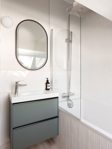 La salle de bain, d’une surface de seulement 5 m², a fait l’objet d’un travail précis d’optimisation. Elle accueille désormais un lavabo double, une douche, une baignoire ainsi qu’une buanderie discrètement intégrée dans un placard sur mesure. Le bureau, impersonnel, a été transformé en un espace polyvalent, capable de se métamorphoser en chambre d’amis grâce à la création d’un coin nuit volontairement cocooning.
