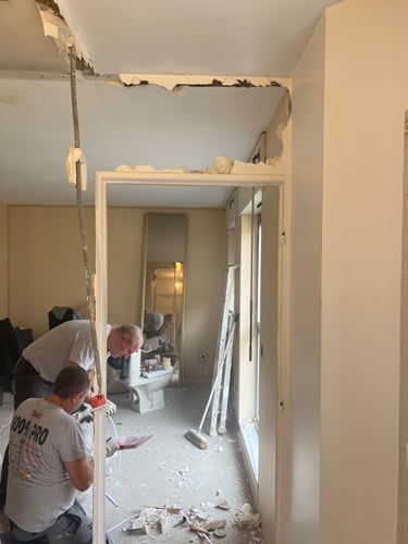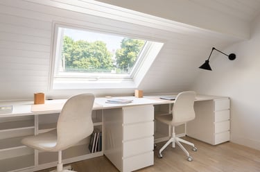 Deux chambres ont été créées, ainsi qu’une salle de douche avec WC, pensées pour offrir à chacun son espace tout en conservant une vraie cohérence d’ensemble. La grande pièce centrale a été repensée comme une salle de travail partagée, intégrant un double bureau, afin de créer un lieu calme, organisé et propice à la concentration.