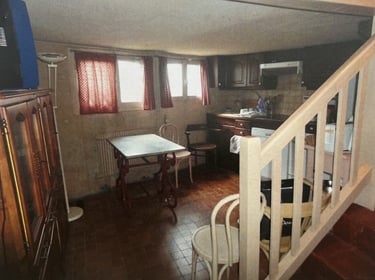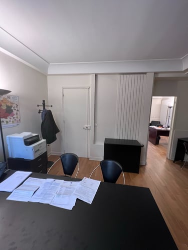 Deux chambres ont été créées, ainsi qu’une salle de douche avec WC, pensées pour offrir à chacun son espace tout en conservant une vraie cohérence d’ensemble. La grande pièce centrale a été repensée comme une salle de travail partagée, intégrant un double bureau, afin de créer un lieu calme, organisé et propice à la concentration.