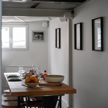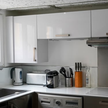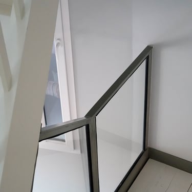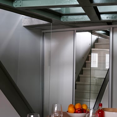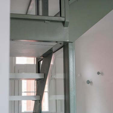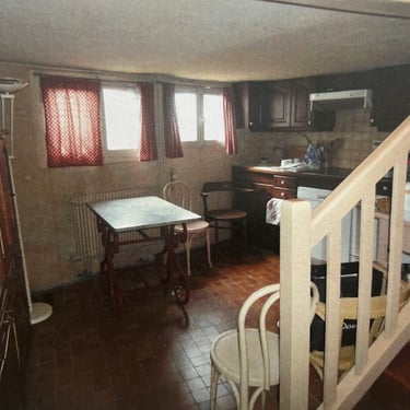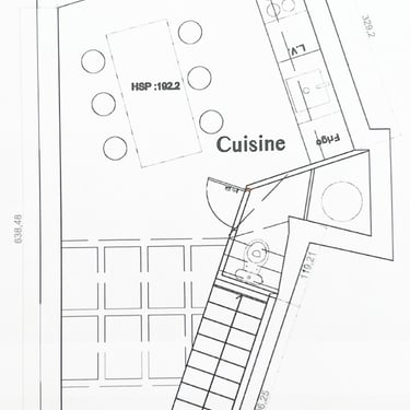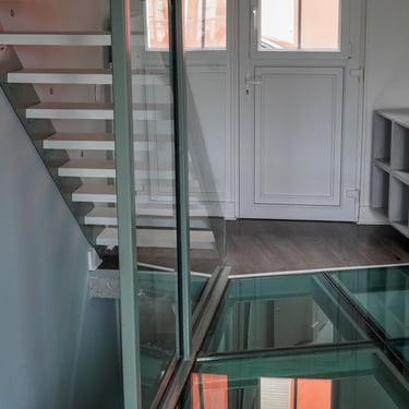 Deux contraintes étaient à prendre en compte : un escalier central qui empiétait sur les volumes du RDC et du R-1, et un R-1 alimenté par de petites ouvertures qui offraient une faible luminosité. En plus de la rénovation complète, l'escalier a été repris et positionné contre une cloison existante, libérant ainsi un maximum d'espace, et un ensemble de carreaux de verre à été intégré au sol du RDC de façon a déployer la lumière vers le R-1 accueillant désormais une grande cuisine avec espace de repas.
