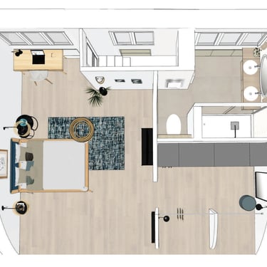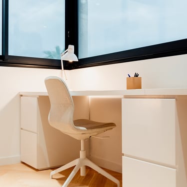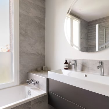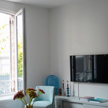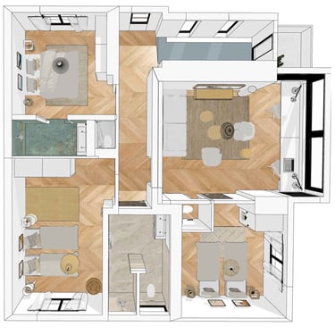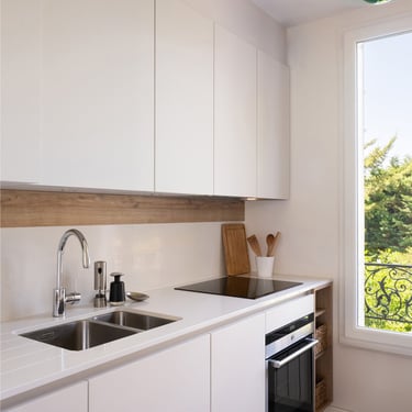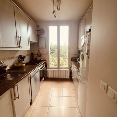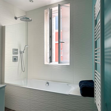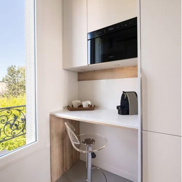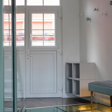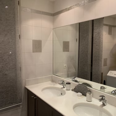 La cliente souhaitait se réapproprier son appartement afin qu'il soit plus adapté à ses habitudes de vie et à ses goûts. Le plan de départ était de rénover les pièces d'eau et la cuisine... ensemble, nous en avons profité pour créer une véritable entrée et aménager le bureau.